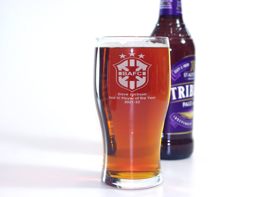 Club trophy for end of season awards. Player of the year etc Engraved pint glass fully customised with name, club logo & full details.