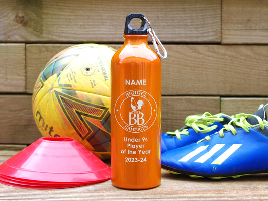 Orange Alternative trophy. Engraved water bottle personalised with name, award and club badge