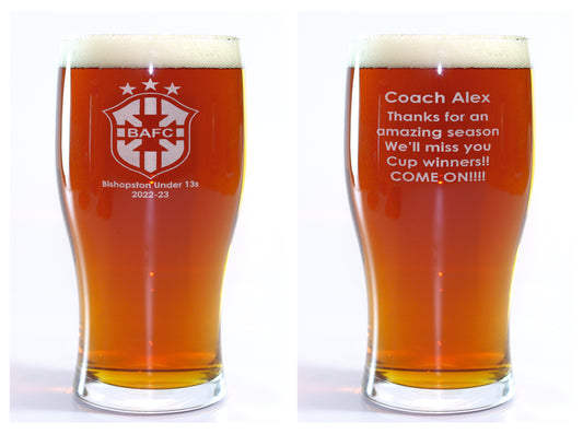 Coach thank you gift. Pint glass personalised with name club badge and message