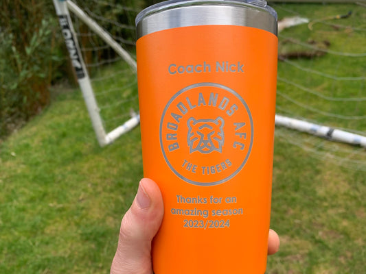 Coach thank you gift. Orange travel mug personalised with name club badge and message