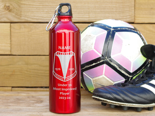 Red Alternative trophy. Engraved water bottle personalised with name, award and club badge
