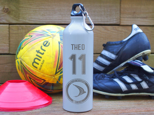 Personalised water bottle with player name and number club crest