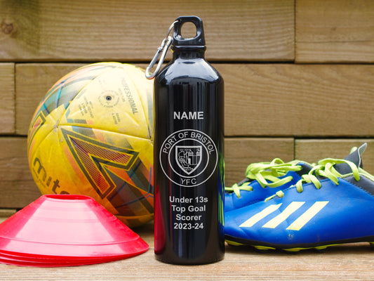 Black Alternative trophy. Engraved water bottle personalised with name, award and club badge